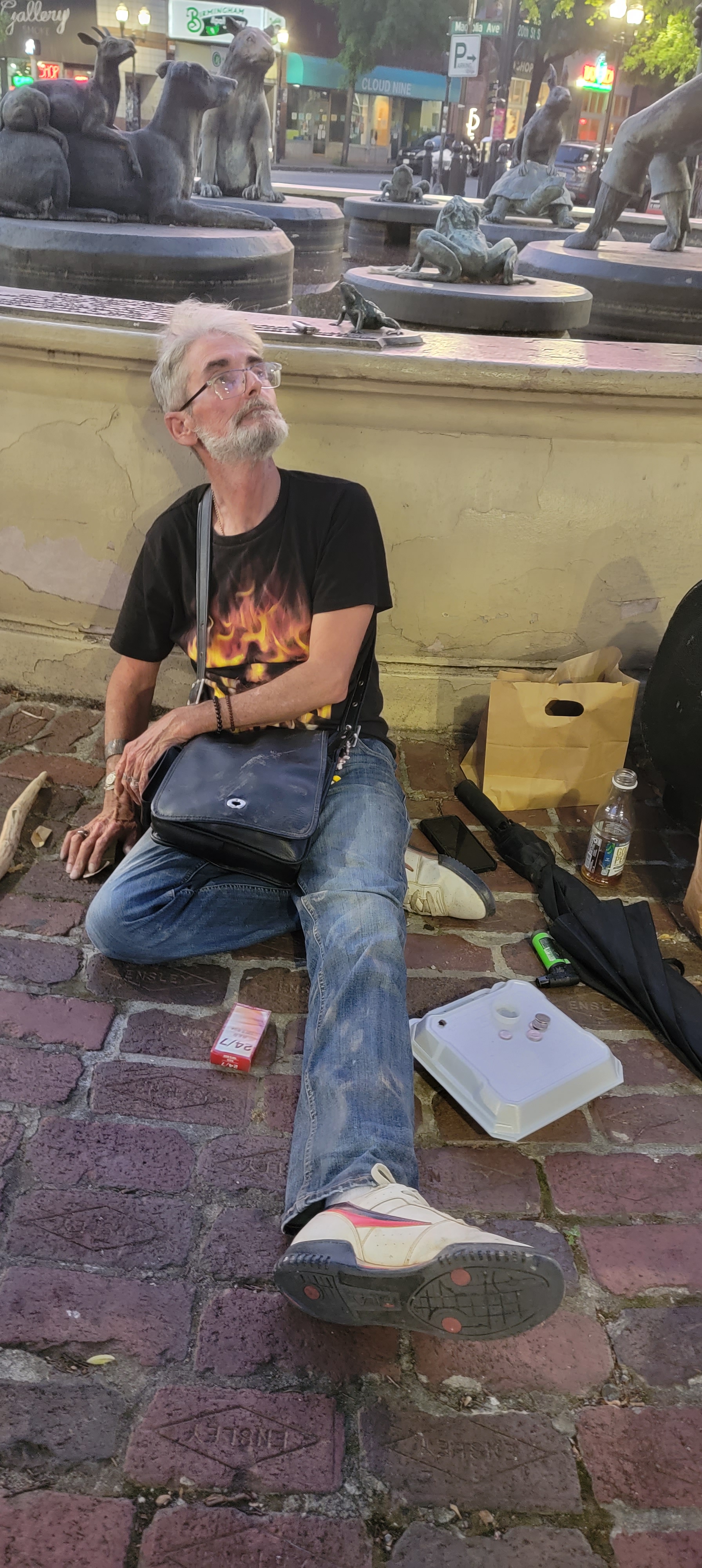 Monday is our 24th wedding anniversary. With impending bad weather predictions, we decided to go a restaurant we haven’t visited in 20 years last Friday. The meal was exceptional as was expected but it was after dinner that brought up long ago memories. We decided to stroll down the street for a bit before heading home and encountered a couple of homeless gentlemen. One had a guitar so we stopped to listen. I got to talking to the other and mentioned I had done a street photography shoot many many years ago in this very spot, capturing the current homeless forever in time. He mentioned one man called three feet…. yes Three Feet was his handle. That prompted me to bring up my website, www.imagesbydonnau.com, on my phone to show him the photos. He correctly named a couple other men in the photos, proving he actually knew them and I had just missed capturing his own photo on that day for some reason. I was thrilled to find that Three Feet was now employed by a local university as an art teacher and had an apartment. This simply made my day, because years ago he was an amazing street artist utilizing spray paint on paper.