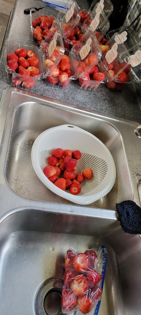 I try not to make a grocery run more than every ten days or so. That was done about a week ago. A friend texted me to let me know of a sale going on at Publix. I’ve never been so excited about a sale. They have fresh large strawberries for .99 cents per 16oz carton!! Evidently their supplier has an over abundance of strawberries due to unusually high amounts of rainfall. Rather than trying to make a profit, Publix management decided to use them as a draw to get people into the store. I was all over that. I went yesterday and bought 10 cartons and back today for ten more. All of those were destined for the freezer. I may make another trip for enough to make a few jars of preserves. But at least I have 20 quarts in the freezer for this winter.