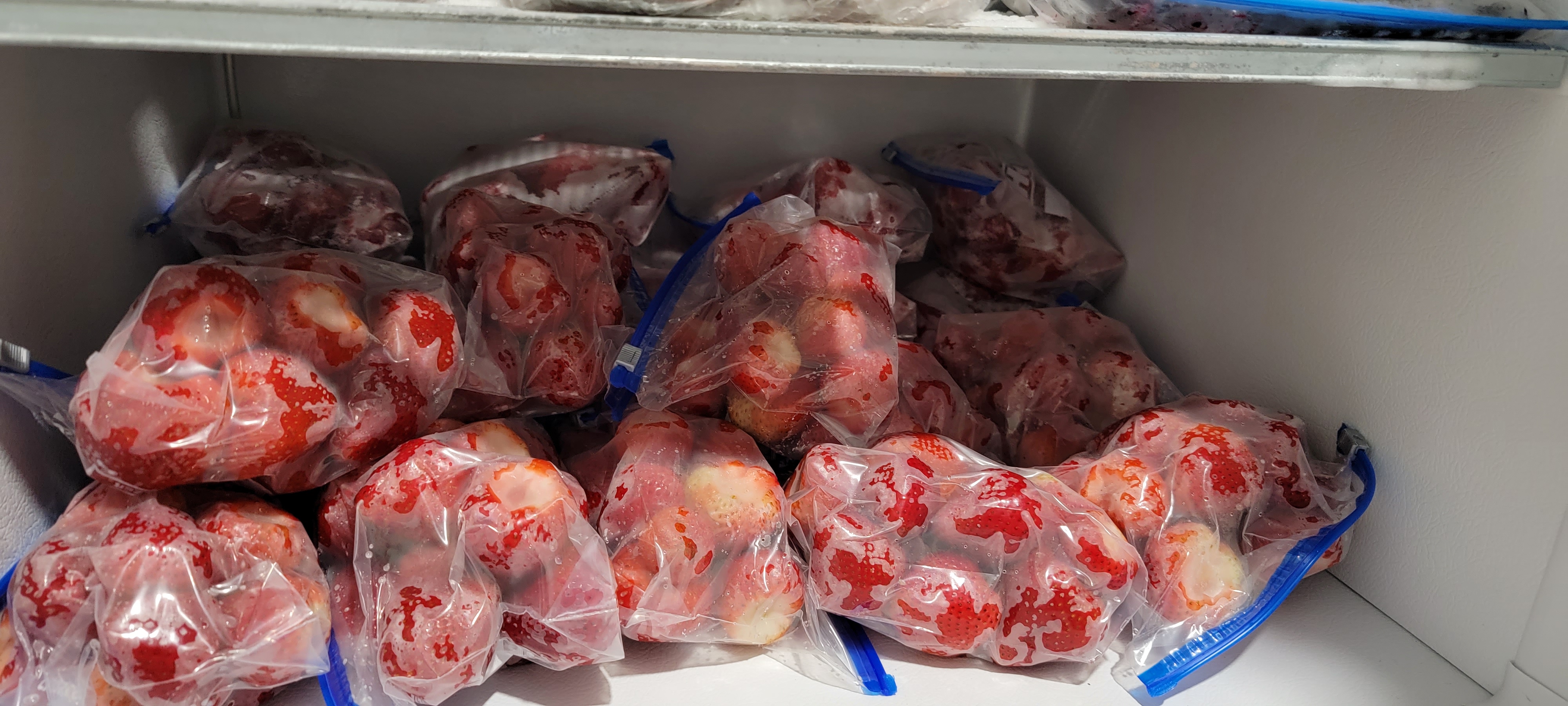 All I did was stem, wash and bag. I left them whole as I will probably use them baked in breads and mashed with sugar for dribbling over my wonderful oat flour biscuits 😉. There was no need to spend time slicing them for that. It also kept me focused on only using one carton per bag. Strawberries are famous for keeping well long term in the freezer.
