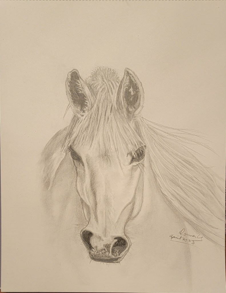 I wanted more of a downward positioned head in motion pose for the second attempt. I also wanted as much detail as possible in her coat, eyes, and nose. A horse has beautiful bone structure in its head that I wanted to capture on paper. The one thing that pushes me to get better at sketching is my love of realistic detail.